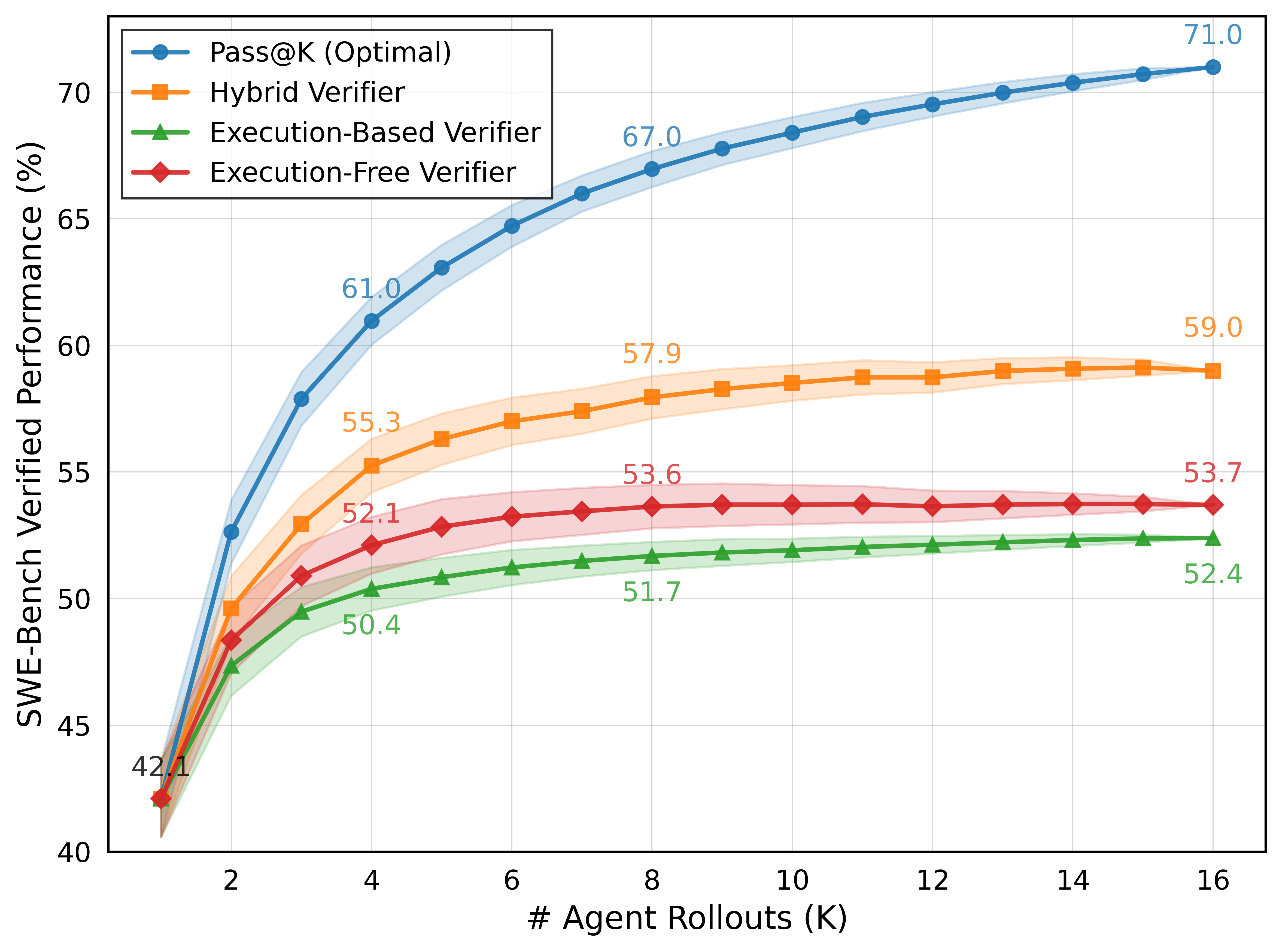 Figure 3: SWE-Bench Verified Performance w.r.t. different TTS strategies. With hybrid TTS, DeepSWE-Preview achieves 59%, beating the current SOTA open-weights model (SkyWork + TTS, 47%) by 12%. We note that only using execution-based and execution-free verifiers is still effective and can bring 10+% performance.