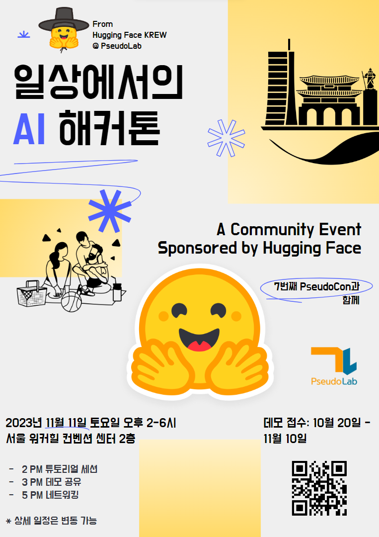 ํ์ฌ HF KREW ํด์ปคํค 2023: ์ผ์์์์ AI๊ฐ ์งํ ์ค์ผ๋ก, ๋ง์ ๊ด์ฌ ๋ถํ๋๋ฆฝ๋๋ค!